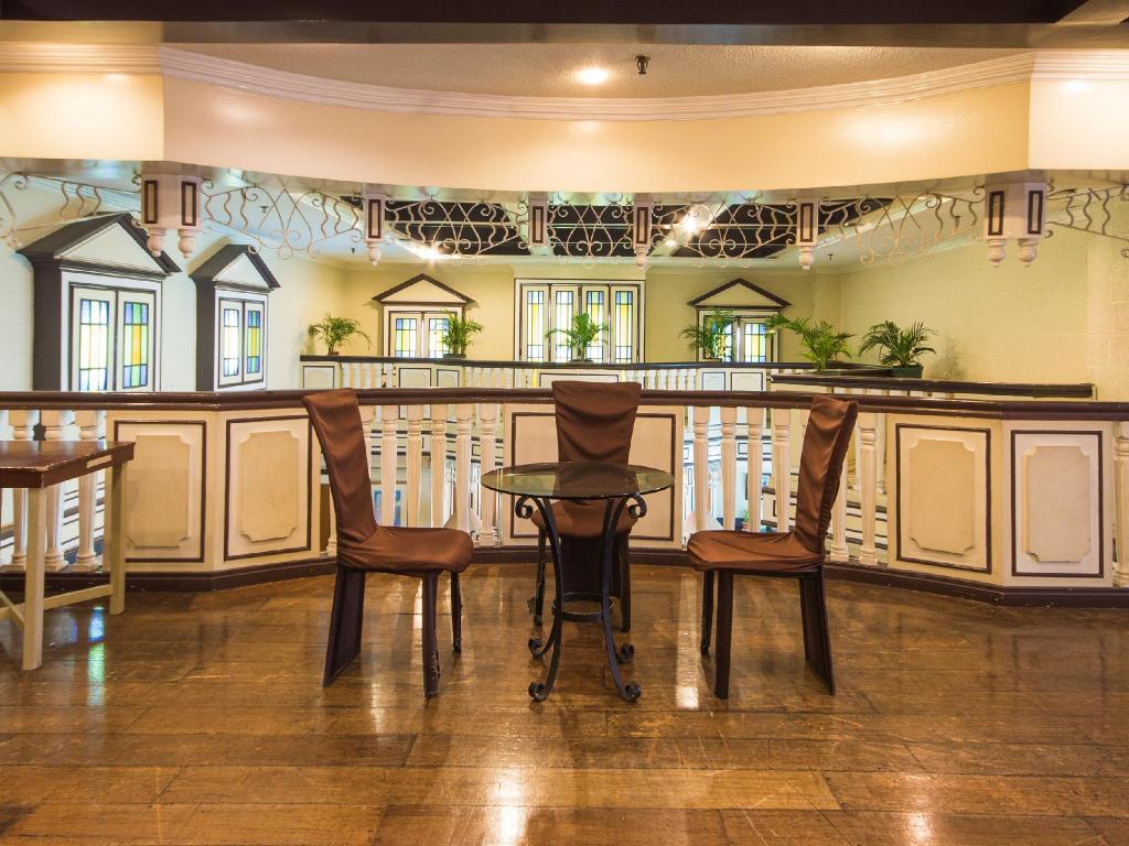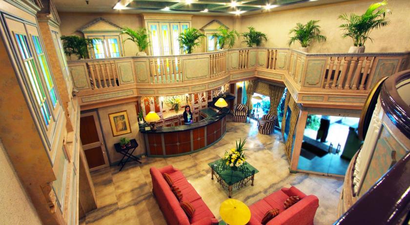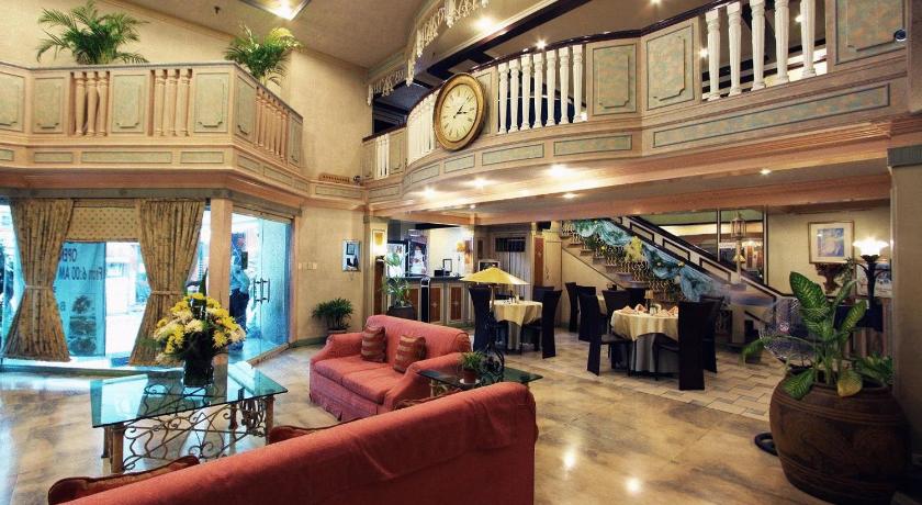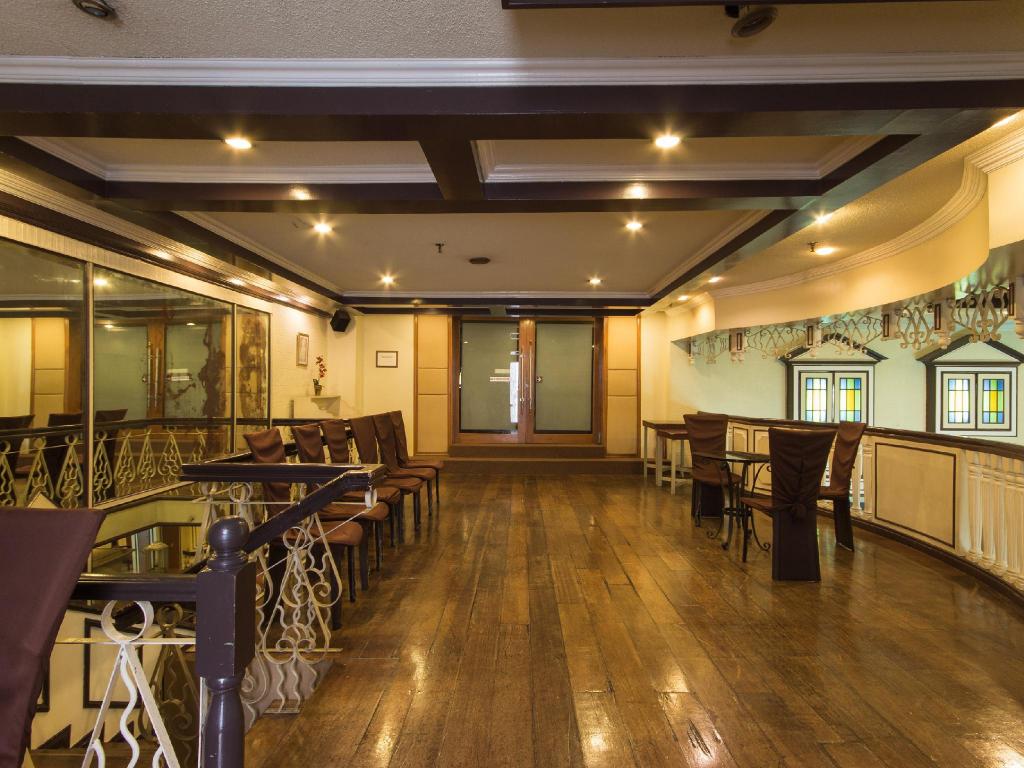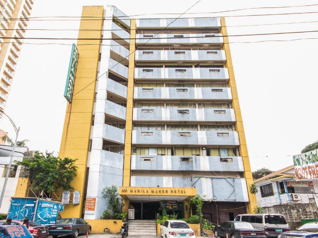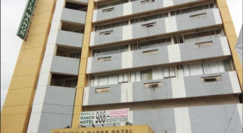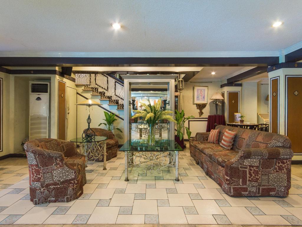 Photos show modest, straightforward rooms with simple furnishings. The lobby reflects a basic, welcoming space. Exterior images highlight the busy streets of Malate, with Robinsons Place mall and local nightlife nearby.